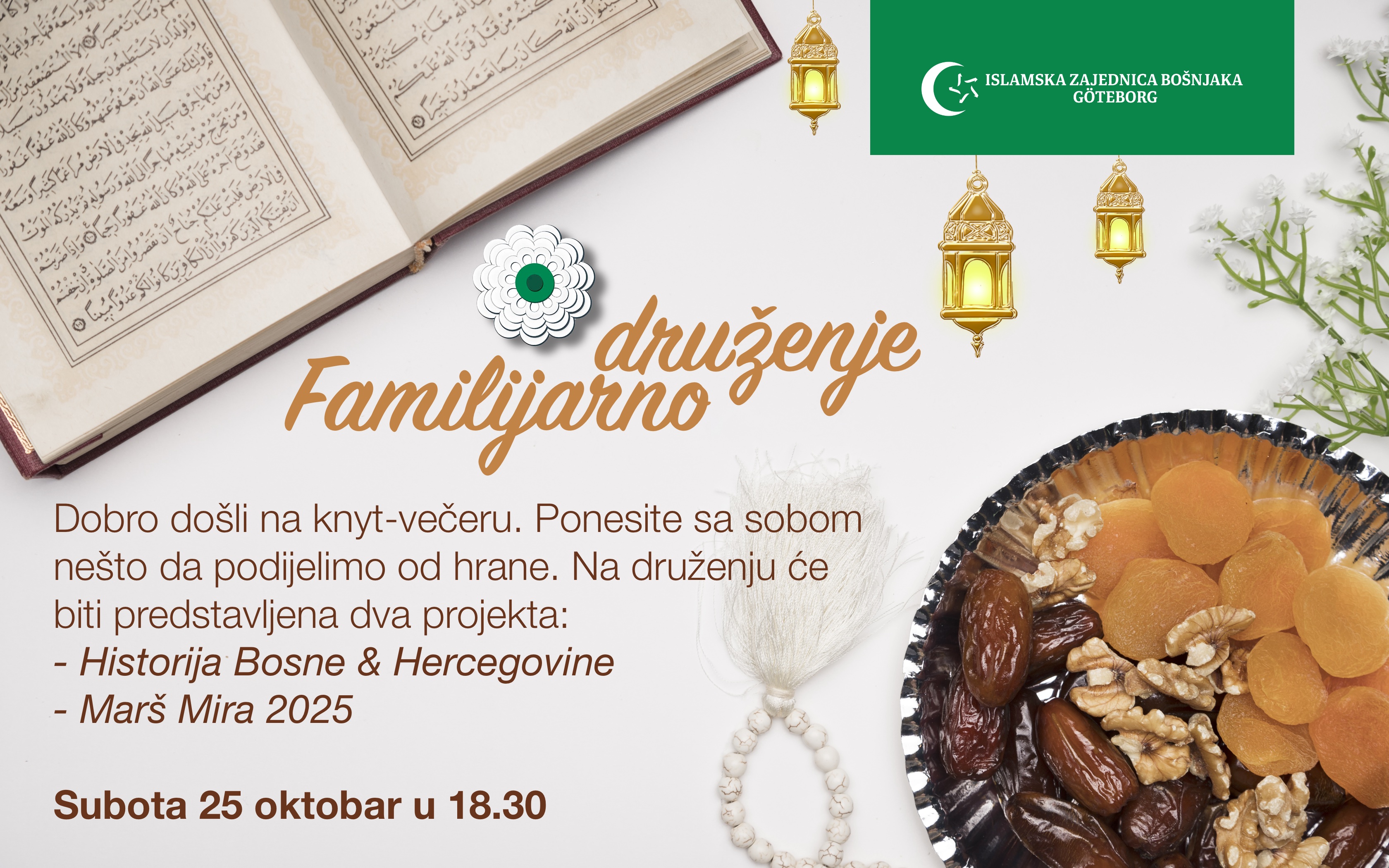 Dođite sa porodicom i prijateljima – neka ovo veče bude ispunjeno osmijesima, razgovorima i zajedništvom! Vidimo se u prostorijama džemata!