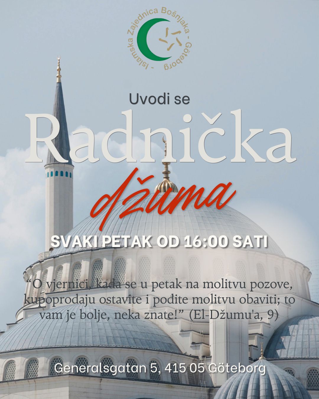 Međutim, zbog potrebe naših džematlija koji su radno angažirani i nisu u mogućnosti stići na redovni termin džume, uvodi se dodatni termin — radnička džuma.